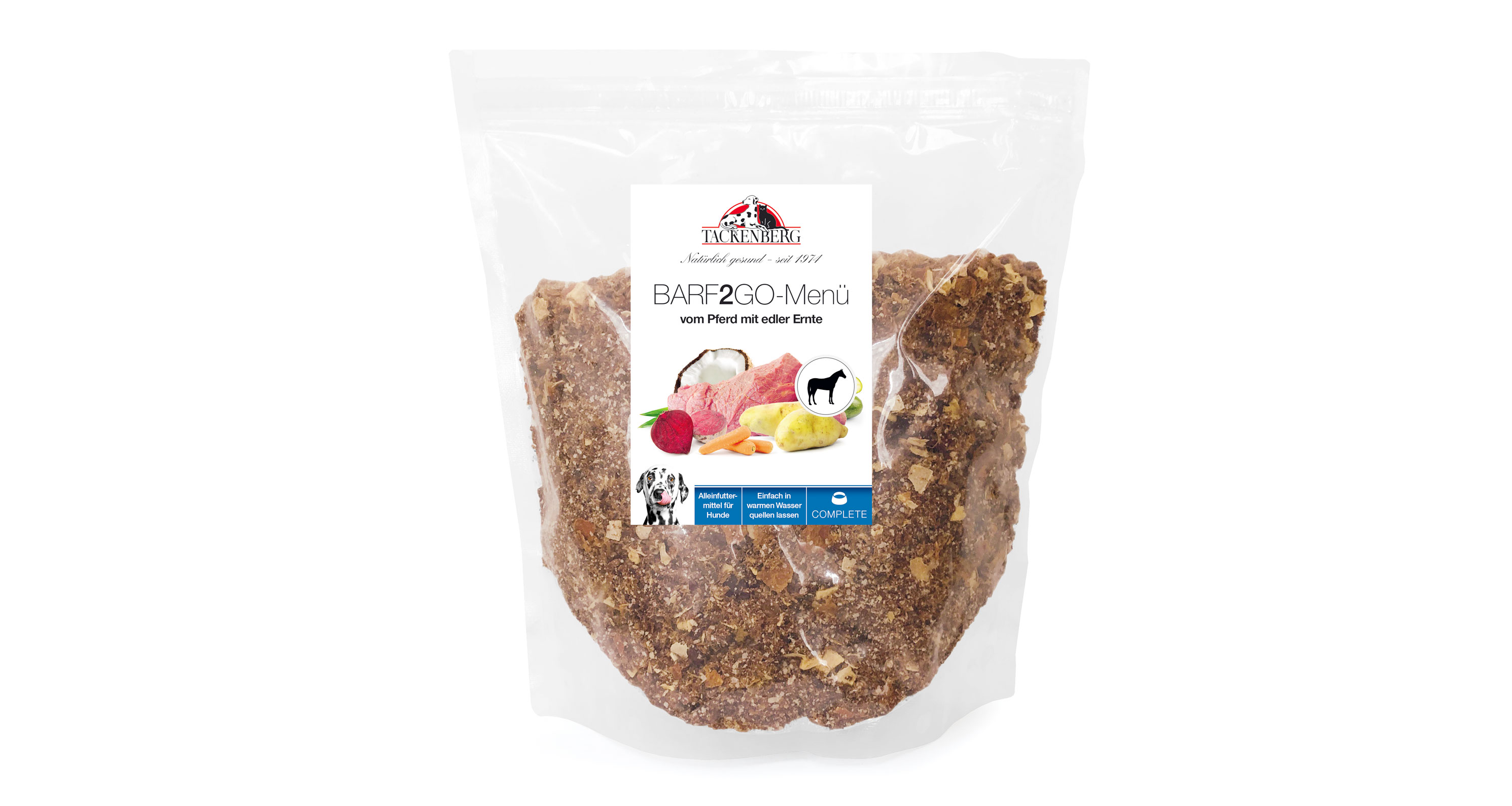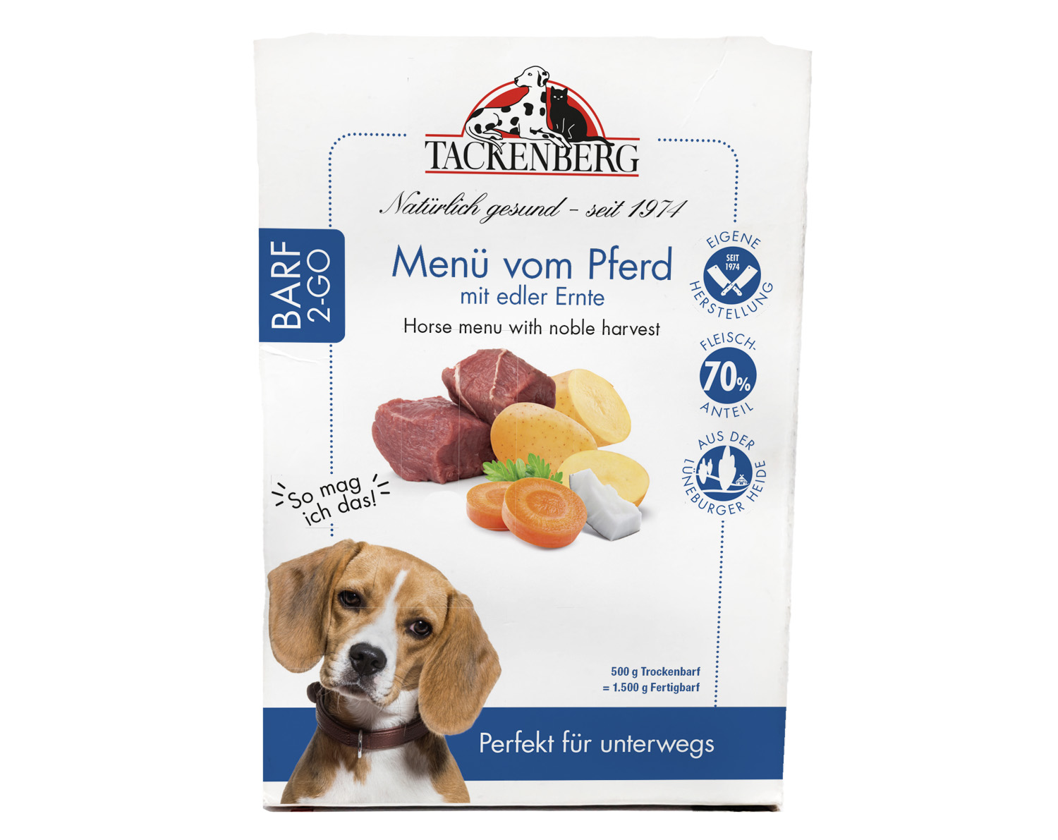 Ab sofort müssen allergische Hunde und Feinschmecker dank BARF 2 GO auch unterwegs nicht auf ihre gesunden Mahlzeiten verzichten. Die praktische 500 g Menü-Verpackung bietet die perfekte Lösung – bei gewohnt erstklassiger TACKENBERG-Qualität!