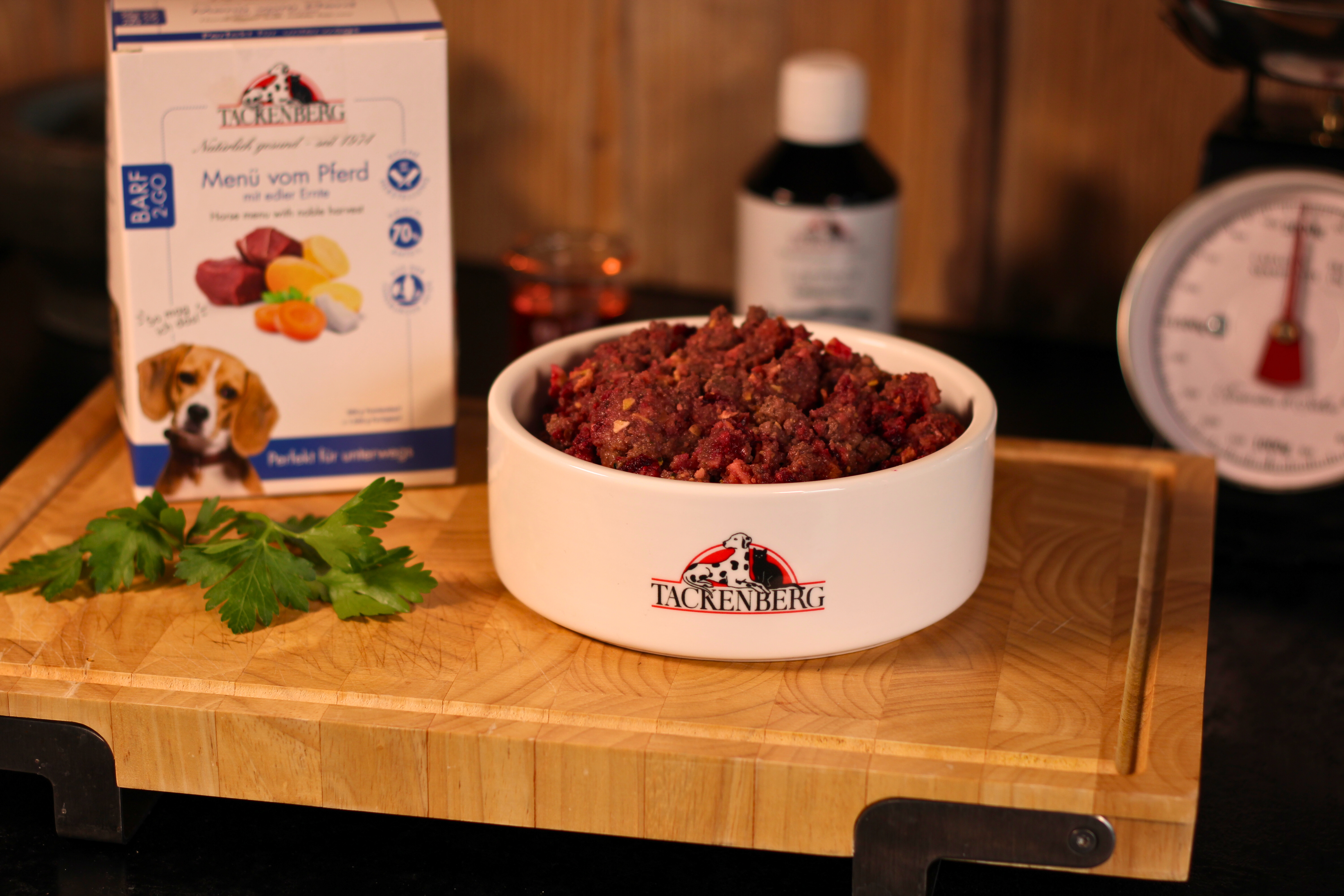 Zubereitung für optimale VerwertungUm die volle Aromaentfaltung und optimale Verwertung der ausgewählten Zutaten zu gewährleisten, gib etwas warmes Wasser zur Menü-Mischung in den Becher und lasse die Mahlzeit für einige Minuten quellen. Dein Hund kann nun seine geliebte TACKENBERG-Nahrung auch unterwegs genießen! Unsere BARF 2 GO-Mahlzeiten kommen ganz ohne künstliche Lock-, Farb-, Aroma-, Füll- und Konservierungsstoffe oder Zuckerzusätze aus. 100 g Trockenbarf entsprechen ca. 300 g im servierfertigen Zustand.