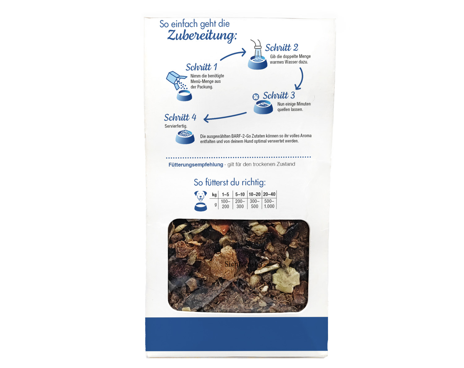 Bei diesem Produkt handelt es sich um ein Alleinfuttermittel. Einfach im warmen Wasser quellen lassen. Angaben aus unserer allgemeinen Fütterungsempfehlung sind Richtwerte und können bei deinem Tier individuell je nach Aktivität, Haltung und Rasse abweichen.