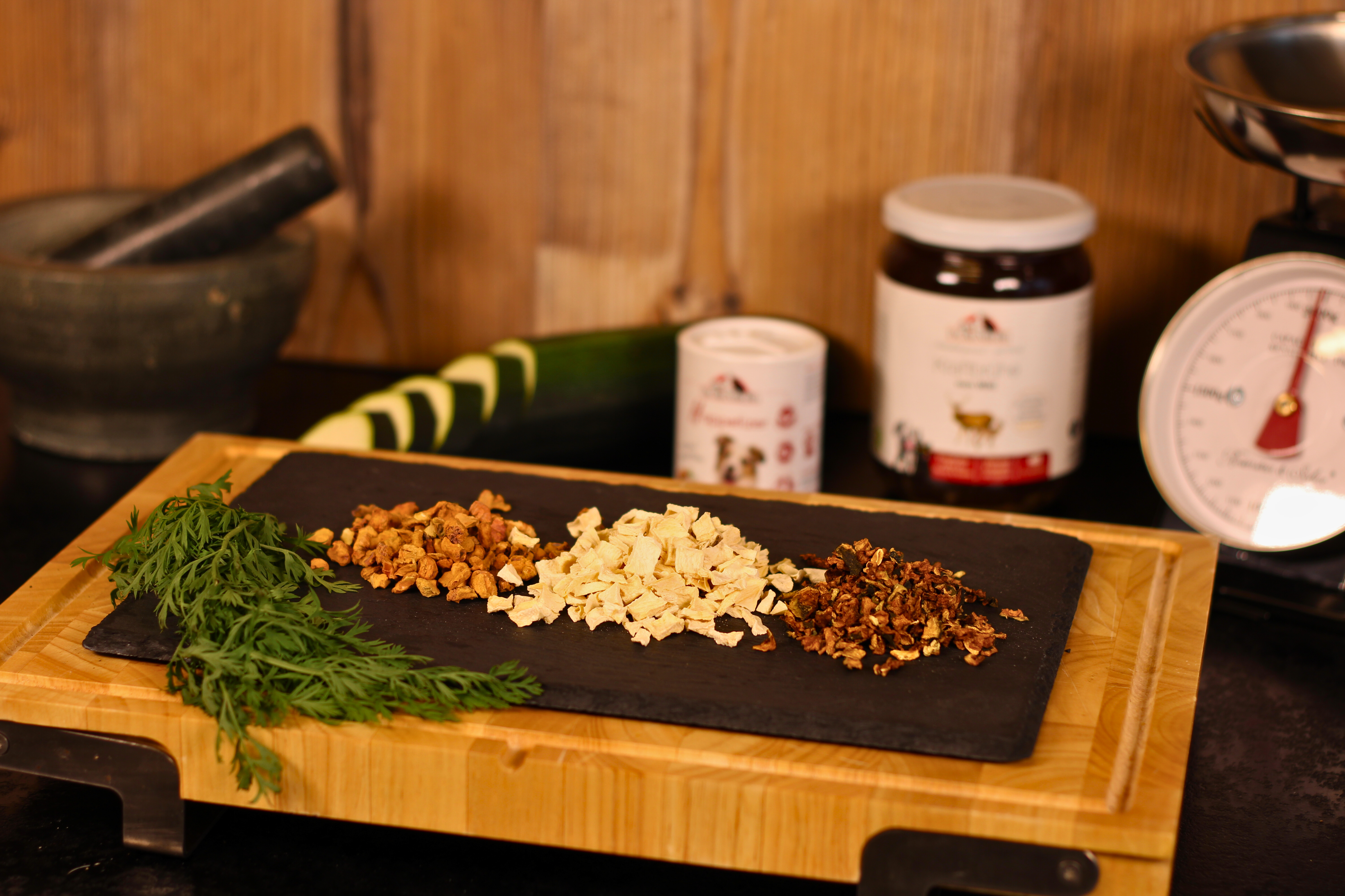 - getrocknete BIO-Zucchini Flocken, ideal als Ergänzung zur Fleischfütterung