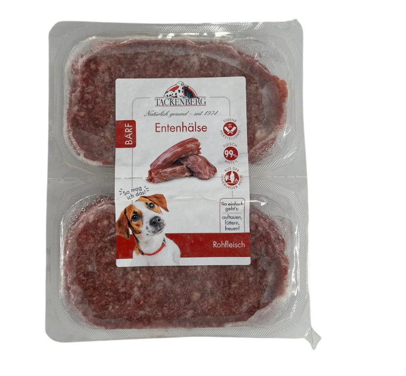 Entenhälse sind ein wahrer Gaumenschmaus für Hunde und Katzen. Ob als vollständige BARF-Mahlzeit oder als nahrhafter Bestandteil einer abwechslungsreichen Rohfleisch-Ernährung - unsere fressfertig verarbeiteten Entenhälse sorgen für eine schmackhafte und unkomplizierte Fütterung, selbst für anspruchsvolle Haustiere.