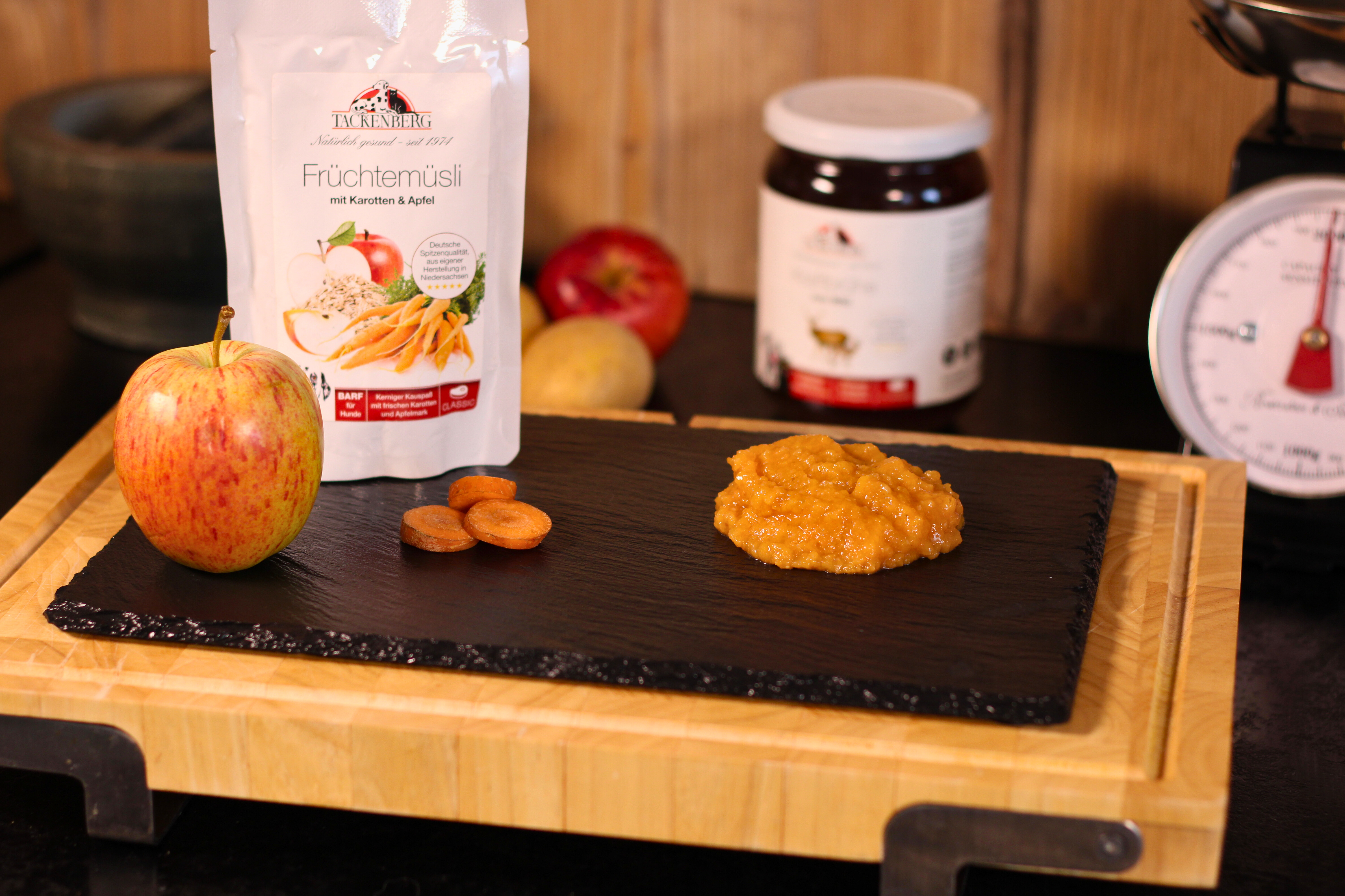 Entdecke jetzt unser delikates Müsli mit frischen Karotten, saftigem Apfelmark und zarten Haferflocken! Dieses feine Püree ist die ideale Ergänzung zur BARF-Ernährung deines Hundes und sorgt für eine ausgewogene Mahlzeit.