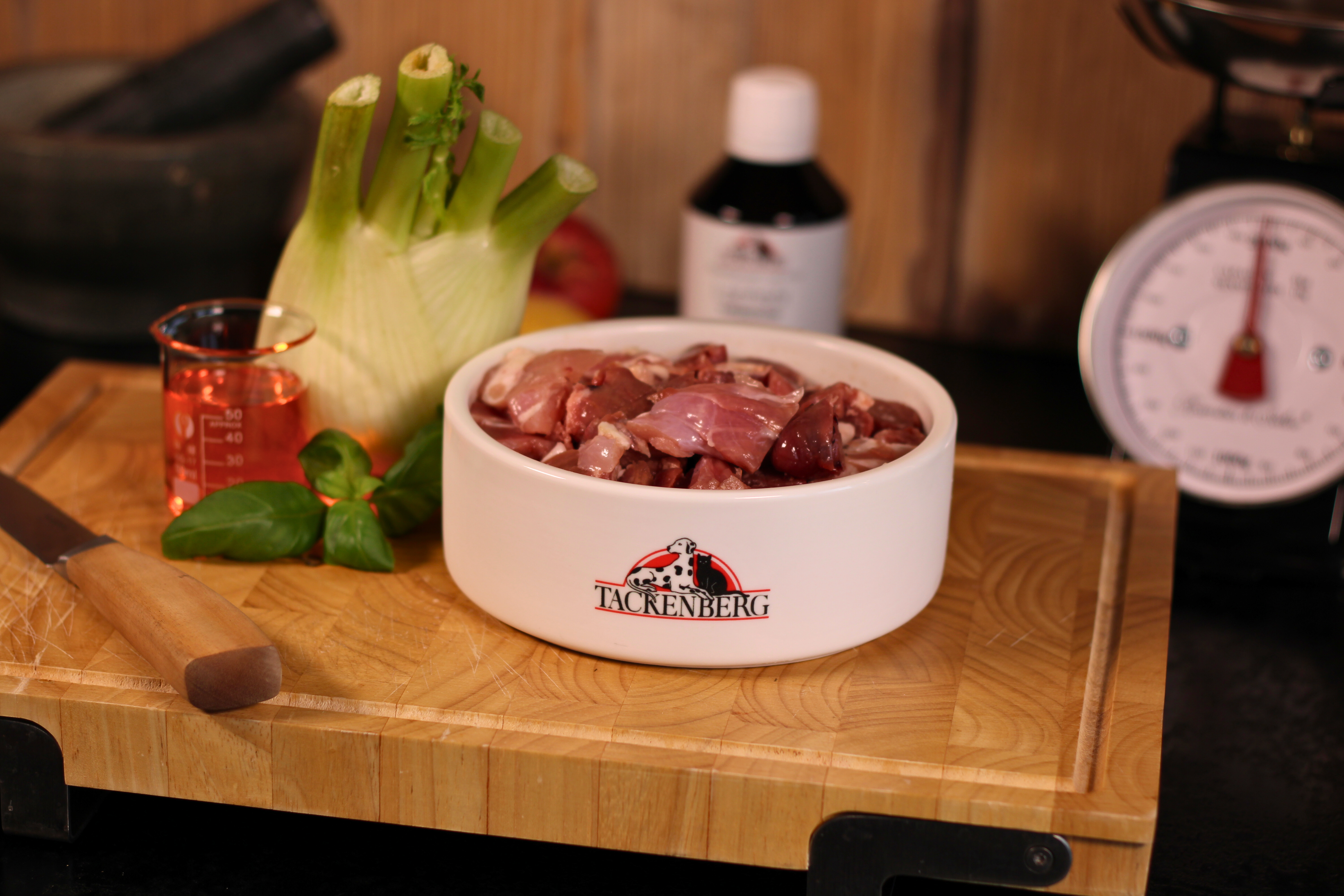 Um eine ausgewogene Mahlzeit zu gewährleisten, empfehlen wir bei Hunden ein Verhältnis von ca. 80% Fleisch und Innereien &, 20% pflanzlicher Komponente.