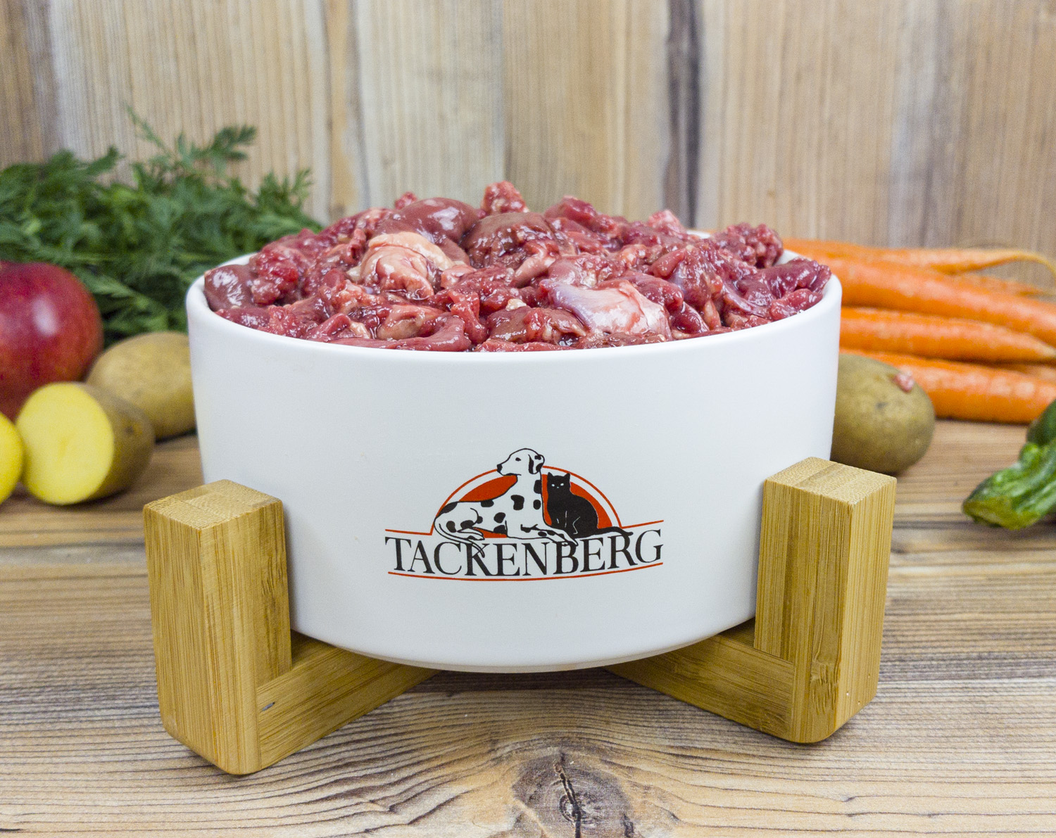 Um eine ausgewogene Mahlzeit zu gewährleisten, empfehlen wir bei Hunden ein Verhältnis von ca. 80% Fleisch und Innereien &, 20% pflanzlicher Komponente.