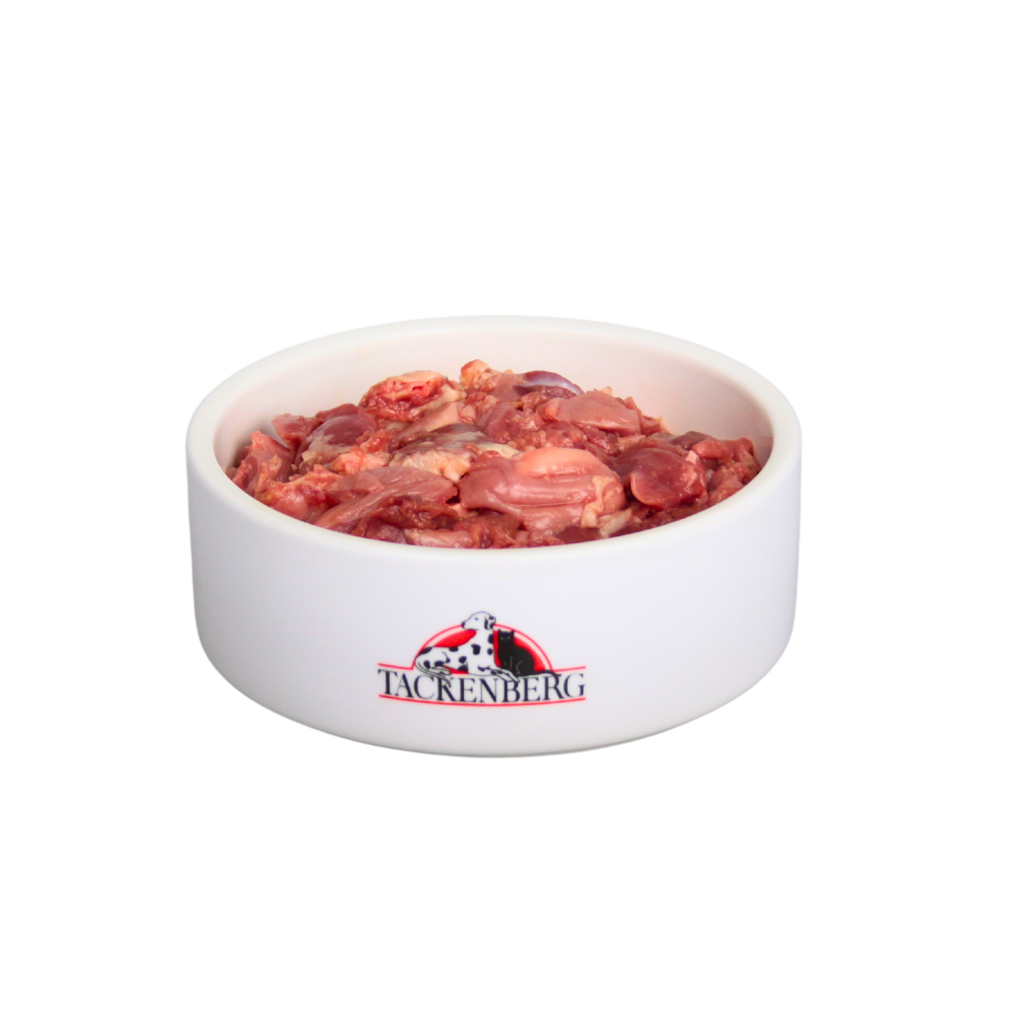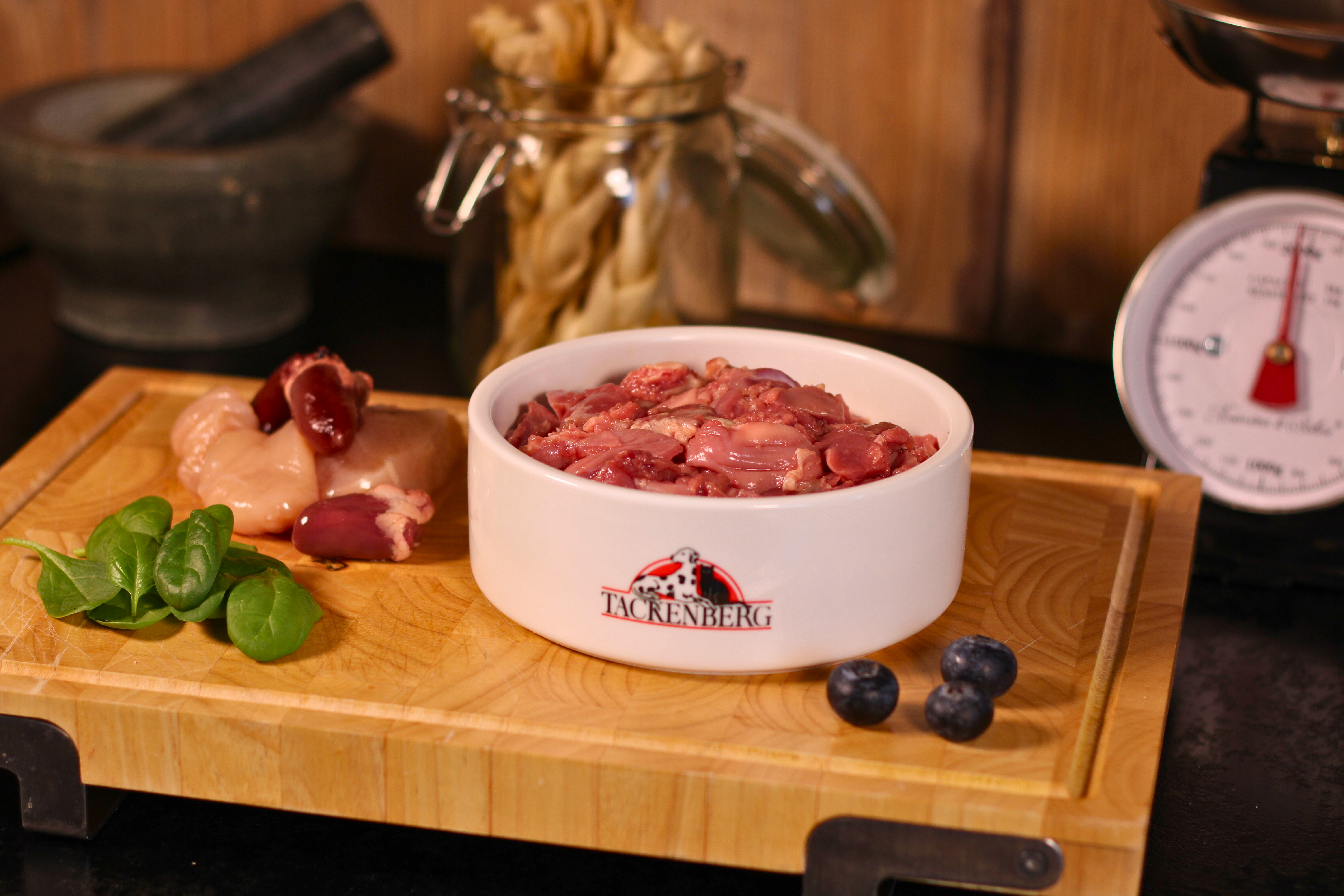 Unsere exklusive BARF-Geflügelmischung mit köstlichen Hühnerherzen und saftigen Hühnermägen wird auch wählerische Tiere begeistern. Das ausgewählte Muskelfleisch ist besonders mager und eignet sich perfekt für den Einstieg in die Rohfleischfütterung oder als Diätfutter für übergewichtige oder empfindliche Hunde und Katzen. In unserer Futtermanufaktur wird das hochwertige Geflügelragout sorgfältig zerkleinert und bietet deinem Liebling zartes Fleisch von bester Qualität: frisch, saftig und leicht zu kauen.