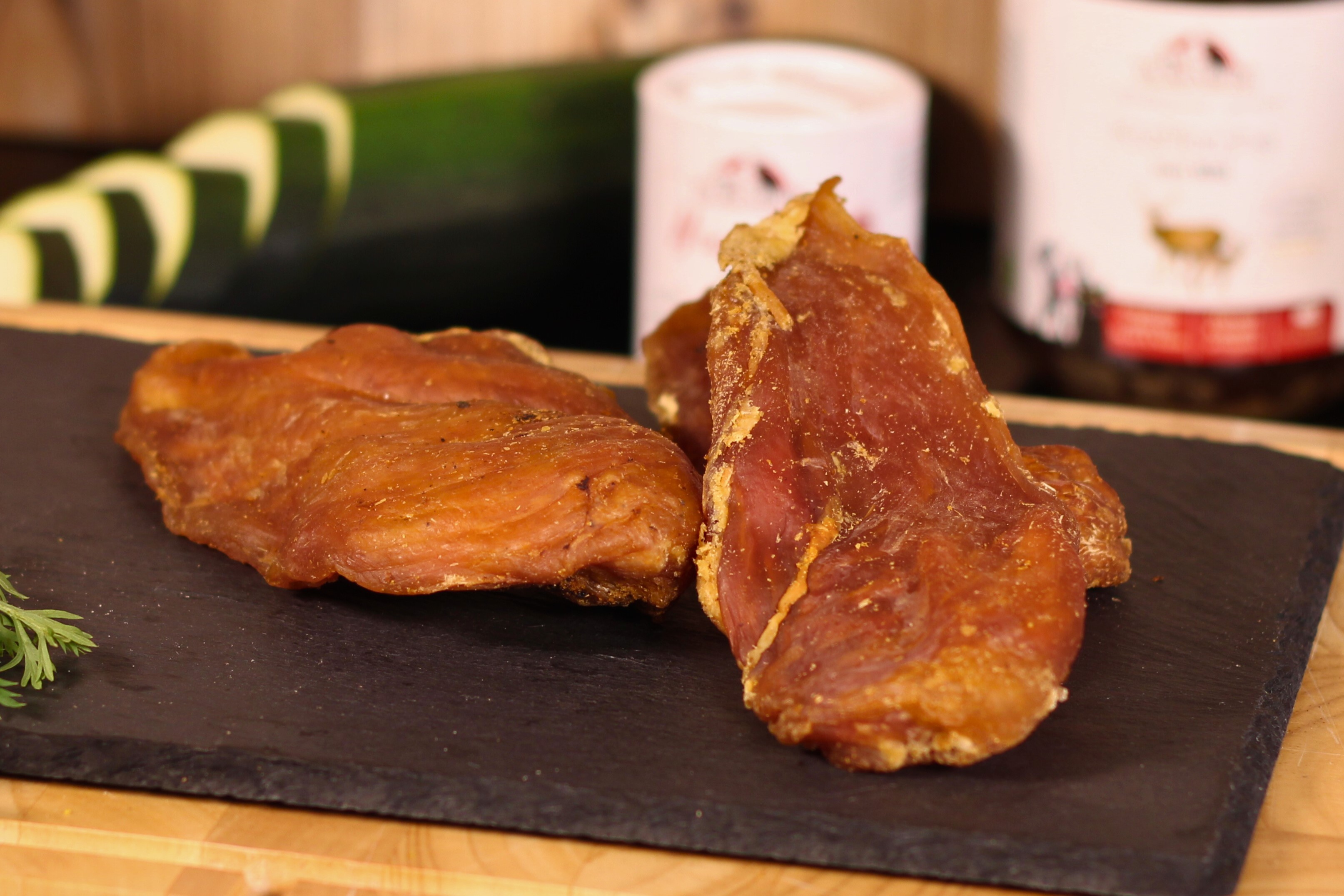 Rohes Huhn ist ein echter Gaumenschmaus für Vierbeiner, aber auch getrocknetes Hühnerfleisch erfreut sich großer Beliebtheit: Unser getrocknetes Hühnerbrustfilet ist eine besondere Leckerei, die du deinem Liebling als Belohnung zwischendurch gönnen kannst.