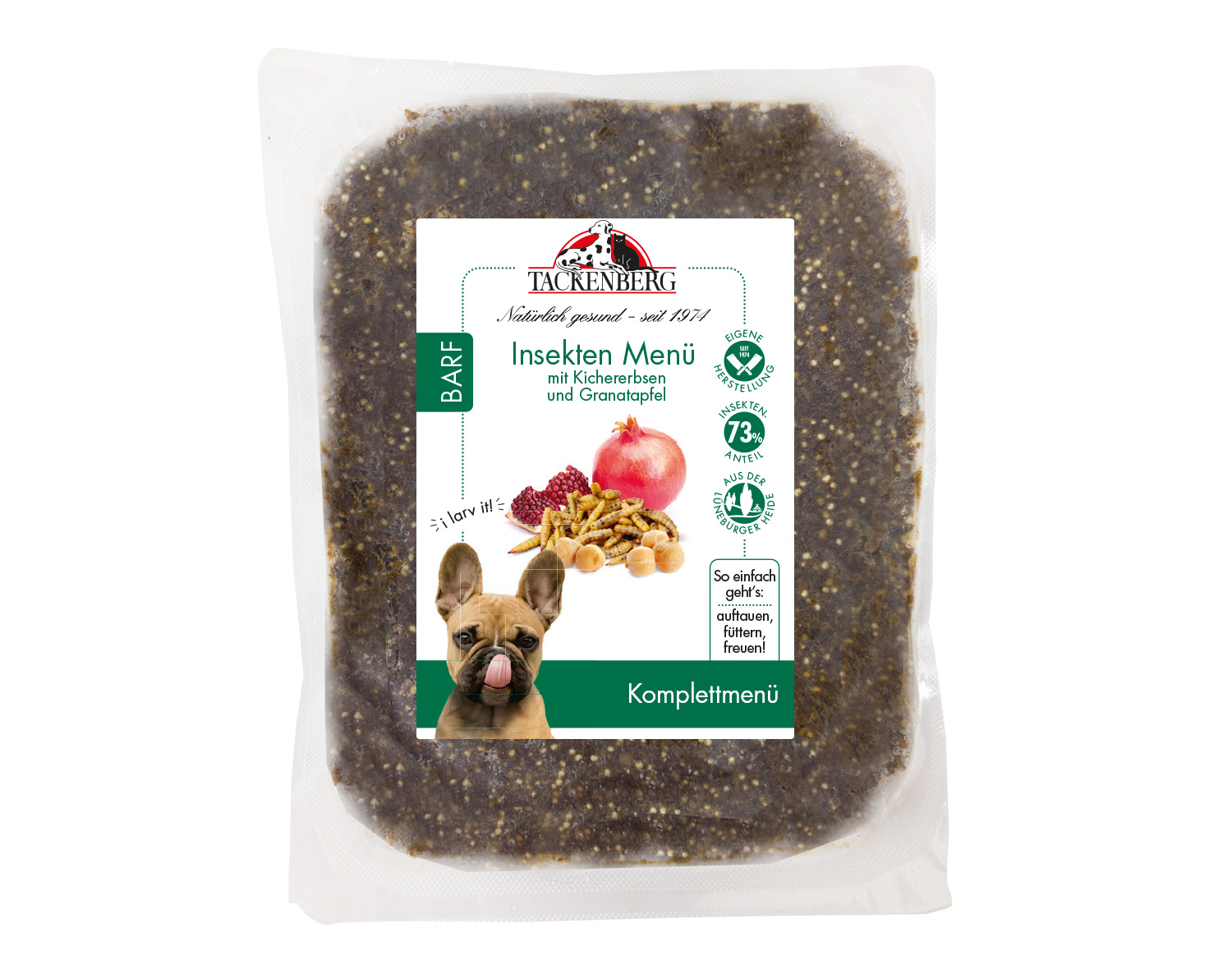 Dieses besondere BARF-Menü bietet deinem Vierbeiner eine ausgewogene Mischung aus proteinreichen Insekten (Mehlwürmer) und hochwertigen Superfoods. Die nachhaltige Kombination von Insekten-Barf mit ballaststoffreichen Kichererbsen und vitamin- sowie mineralstoffreichem Granatapfel fördert die Vitalität und das Wohlbefinden deines Hundes. Selbst für allergische Hunde ist dieses innovative Insekten-BARF eine wahre Delikatesse. Einfach das gefrorene Menü auftauen und direkt in den Napf geben.