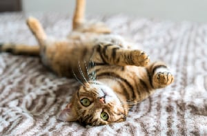 Ist der Körper Deiner Samtpfote unter Spannung und der Schwanz aufgerichtet, deutet das auf fröhliche Aktivierung hin. Zusätzlich wälzt sich Deine Katze auf dem Rücken oder auf die Seite und streckt ihre Pfote nach Dir aus, um Dich zur Interaktion zu bewegen.