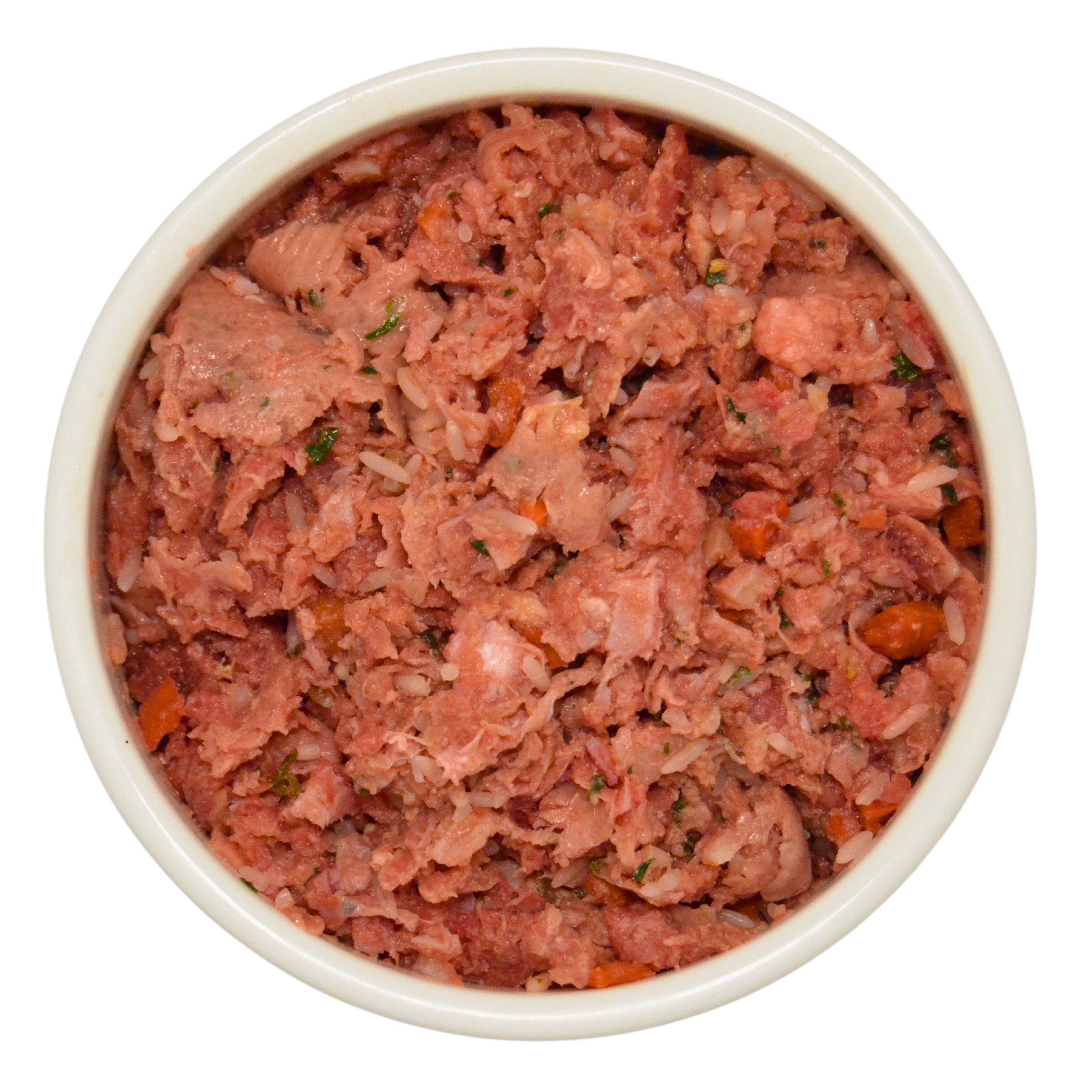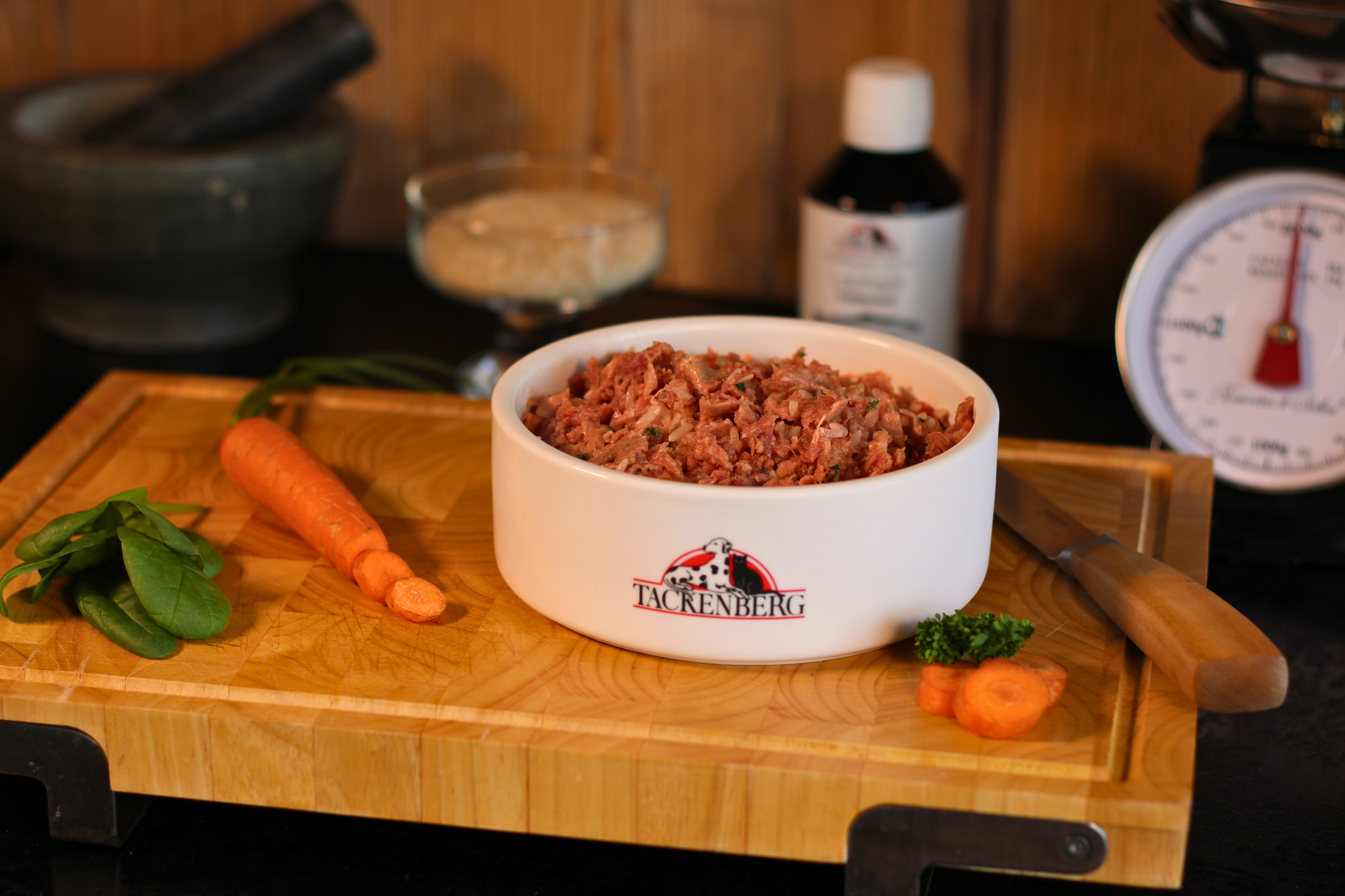 Um eine ausgewogene Mahlzeit zu gewährleisten, empfehlen wir bei Hunden ein Verhältnis von ca. 80 % Fleisch und Innereien & 20 % pflanzlicher Komponente.