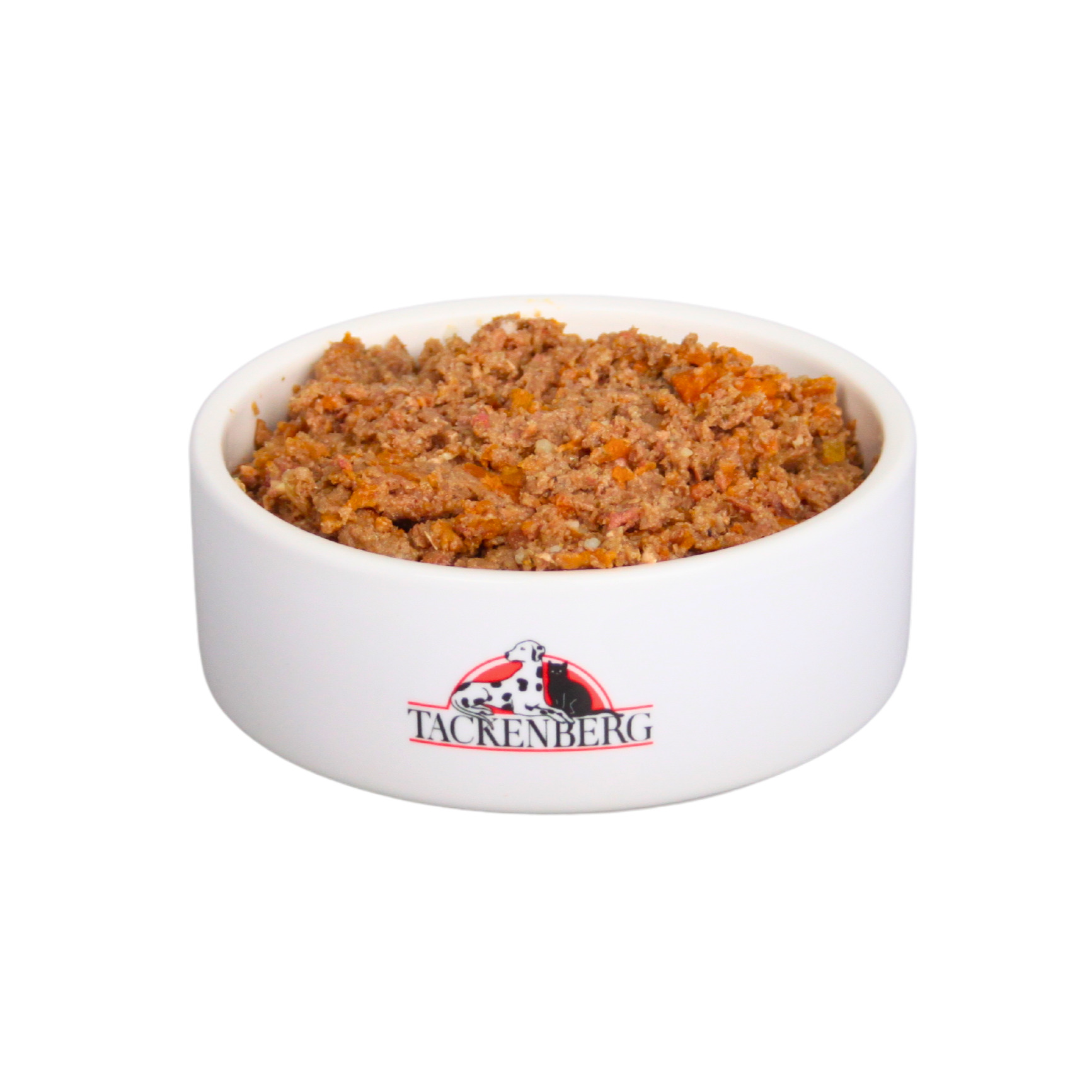 Unser Nassfutter wird schonend hergestellt und enthält nur schlachtfrisches Fleisch, frisches Gemüse, Obst und ausgewählte Kräuter. Die praktische Dose mit Pull-Ring ermöglicht ein einfaches Öffnen, auch ohne Dosenöffner.