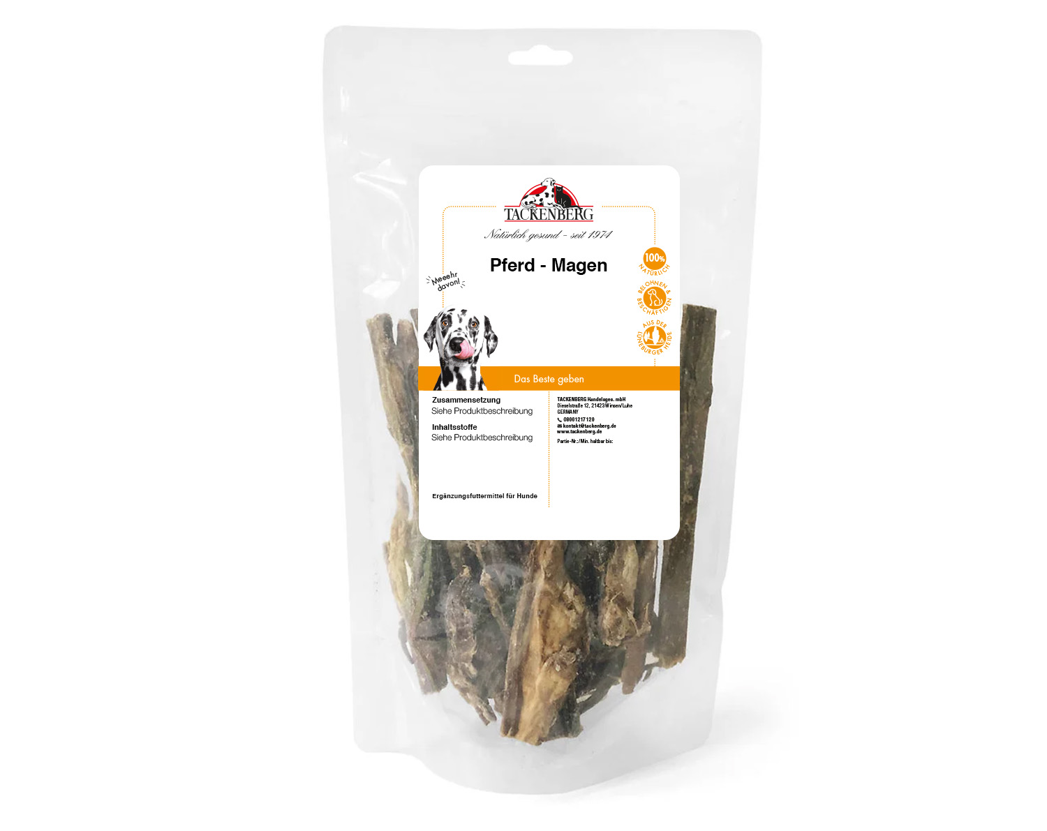 Verwöhne deinen Vierbeiner mit einem schmackhaften TACKENBERG Hundesnack der Spitzenklasse und schenke ihm die Aufmerksamkeit, die er verdient. Mit feinem Pferdemagen von TACKENBERG kannst du deinem Hund eine natürliche und gesunde Belohnung bieten, die nicht nur köstlich schmeckt, sondern auch seine Gesundheit unterstützt.