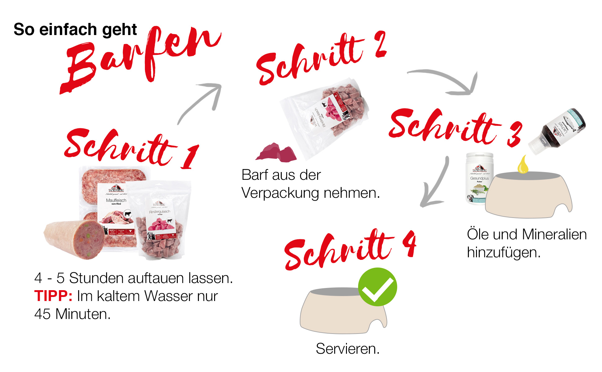 Das Fleisch im warmen Wasserbad auftauen, den enthaltenen Fleischsaft mitverfüttern und darauf achten, dass es vollständig aufgetaut ist. Die ideale Temperatur für die Mahlzeit ist "handwarm". Reste können bedenkenlos in einer Frischhaltedose aufbewahrt werden.