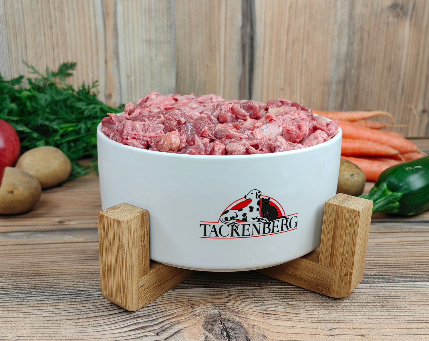 Das Schlundfleisch vom Rind besteht aus zartem Muskelfleisch, das reich an wertvollem Protein ist. Es enthält auch helle Häute, die in kleinen Ringen vorkommen. Für Welpen und Kitten können diese Ringen vor dem Füttern zerkleinert werden, um Verschluckungsgefahr zu reduzieren. Kombiniere das Schlundfleisch mit Gemüse oder anderen pflanzlichen Zutaten, um eine ausgewogene Mahlzeit für deinen Vierbeiner zu kreieren.
