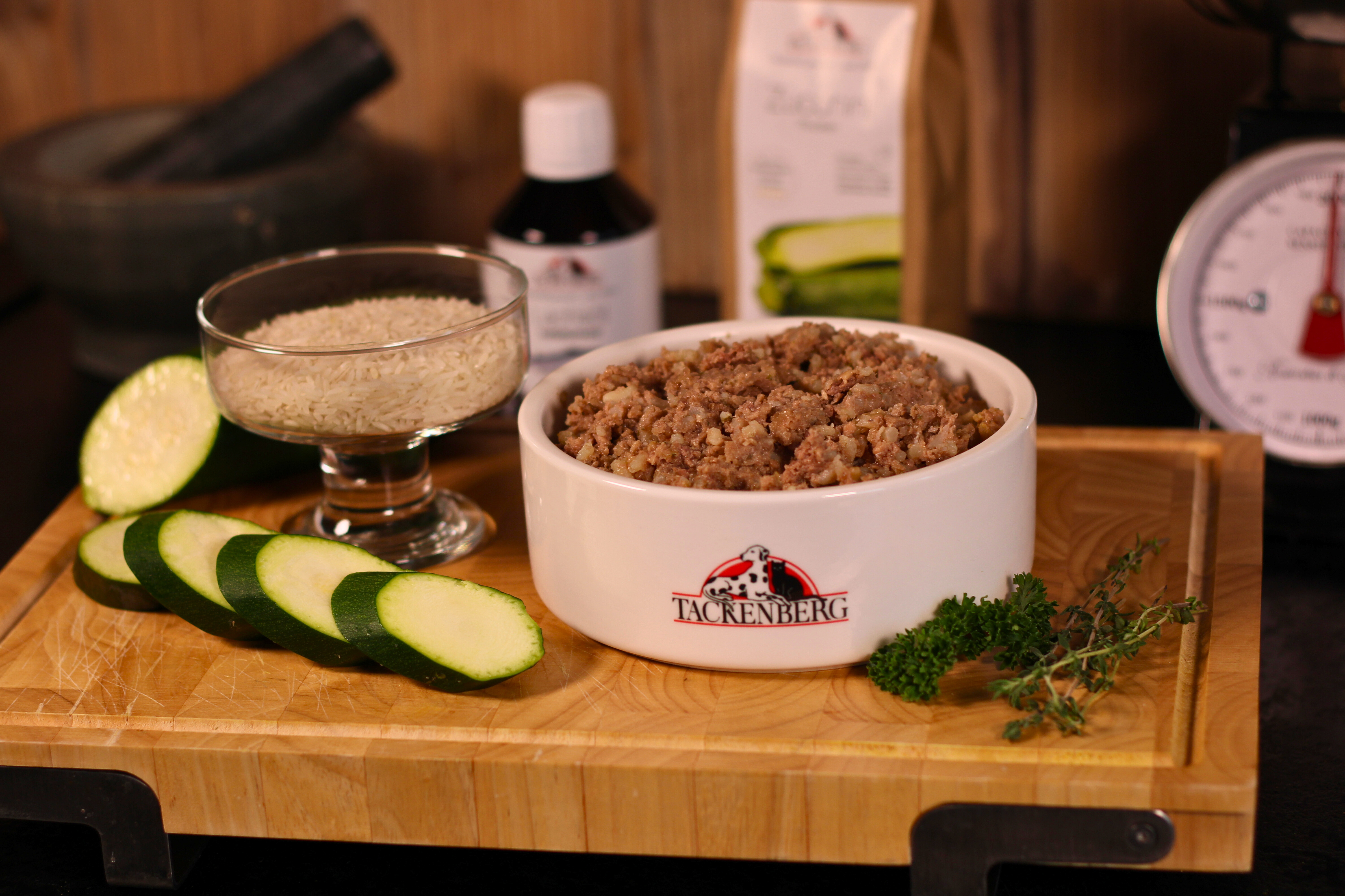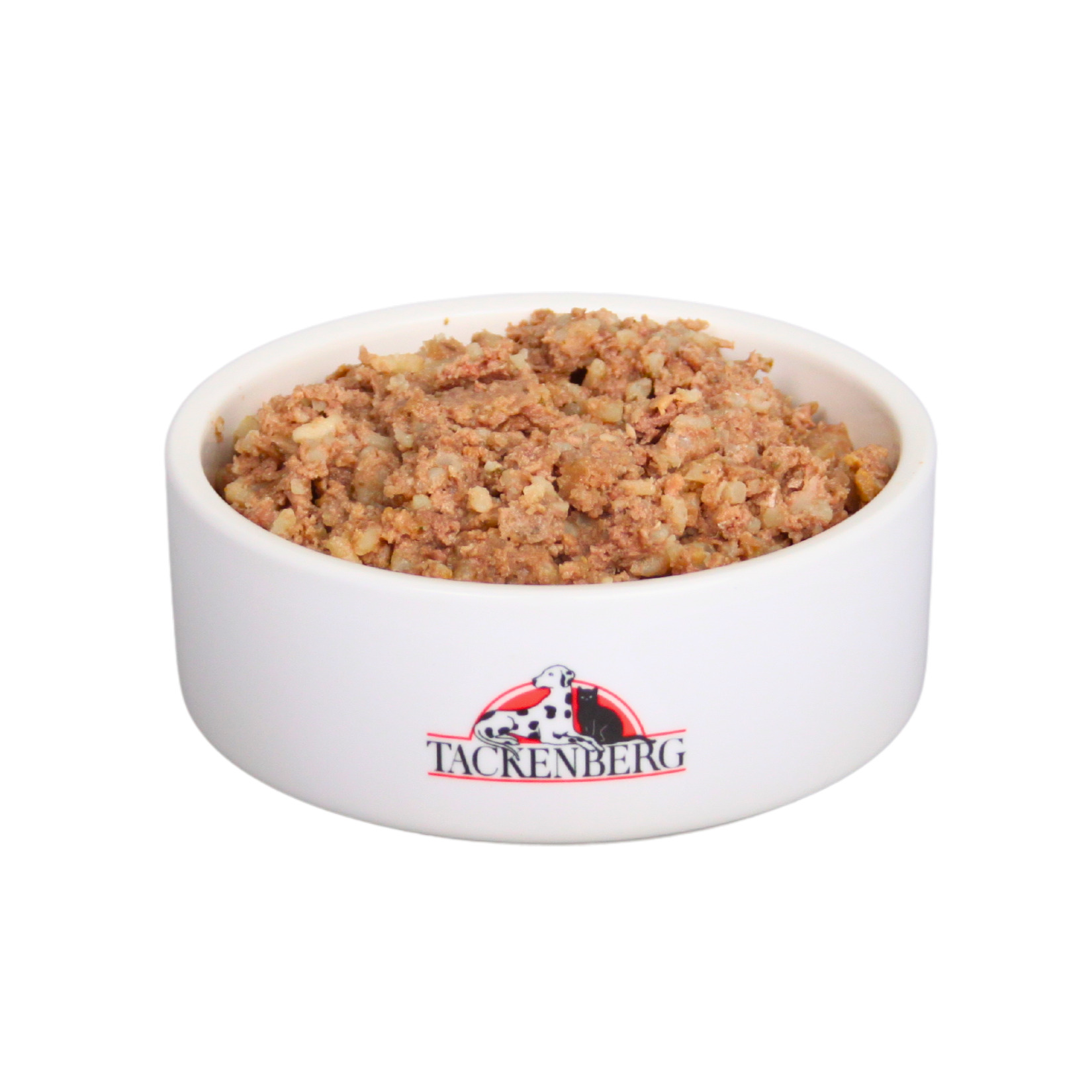 Um eine ausgewogene Mahlzeit zu gewährleisten, empfehlen wir bei Hunden ein Verhältnis von ca. 80 % Fleisch und Innereien & 20 % pflanzlicher Komponente.